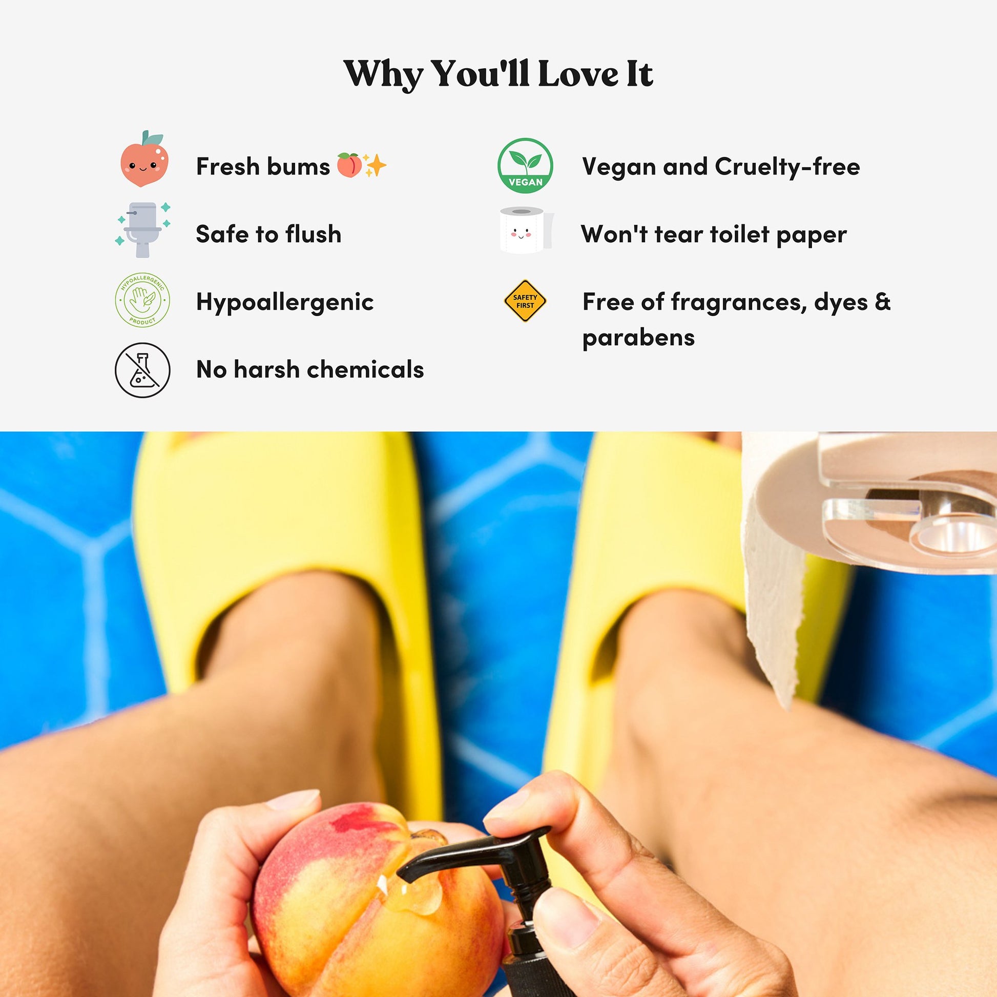 - Fresh Peaches gel turns toilet paper into a wet wipe