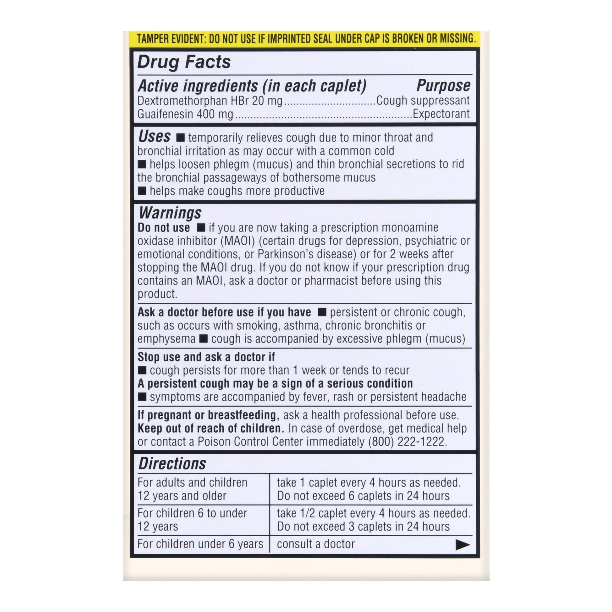 - Active ingredients: 20 mg dextromethorphan HBr (suppresses coughs); 400 mg guaifenesin (an expectorant) in each caplet