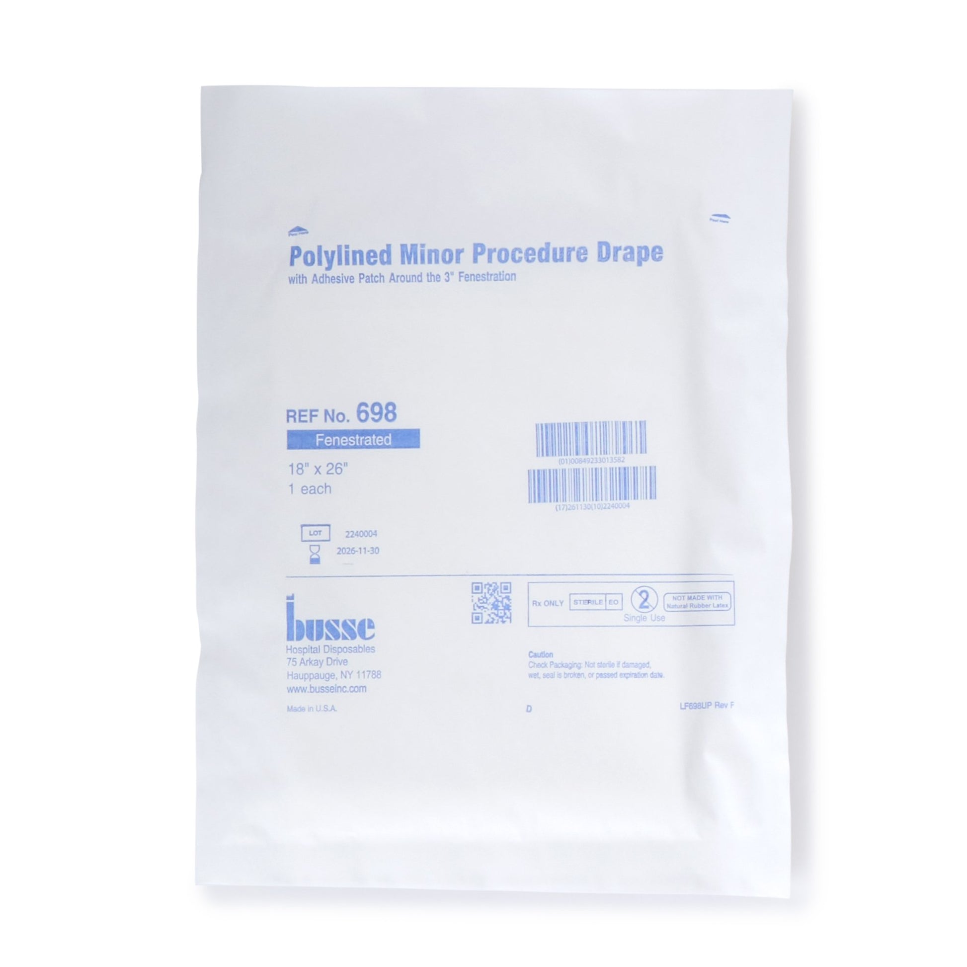 - White sterile minor procedure drape has 3-inch fenestration and an adhesive patch.