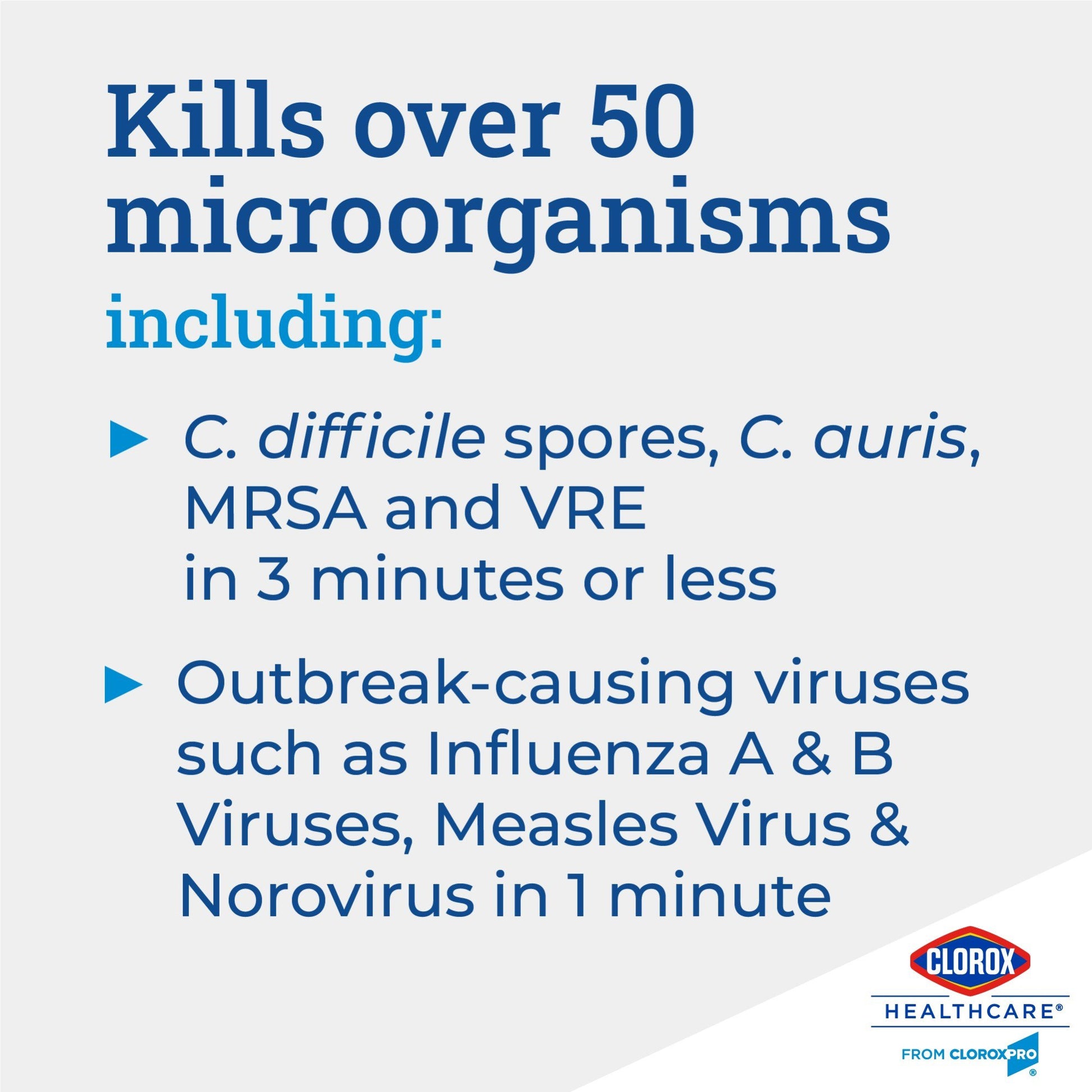 - Disinfect: EPA registered to kill HAI-causing pathogens, including C. diff spores, MRSA and VRE in 3 minutes or less and over 40 other microorganisms in 1 minute