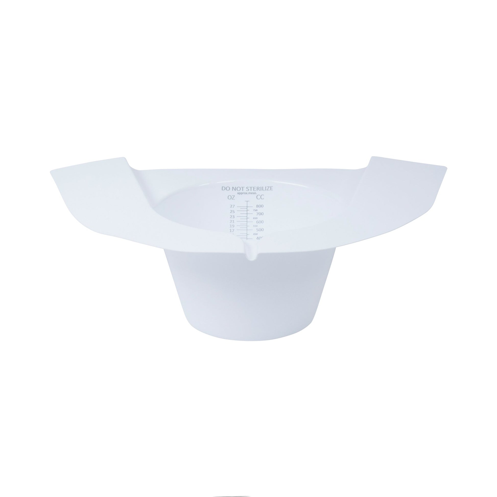 - Graduations measure ounces (2 to 27 at 1 ounce) and cubic centimeters (75 to 800 and 50 cc).