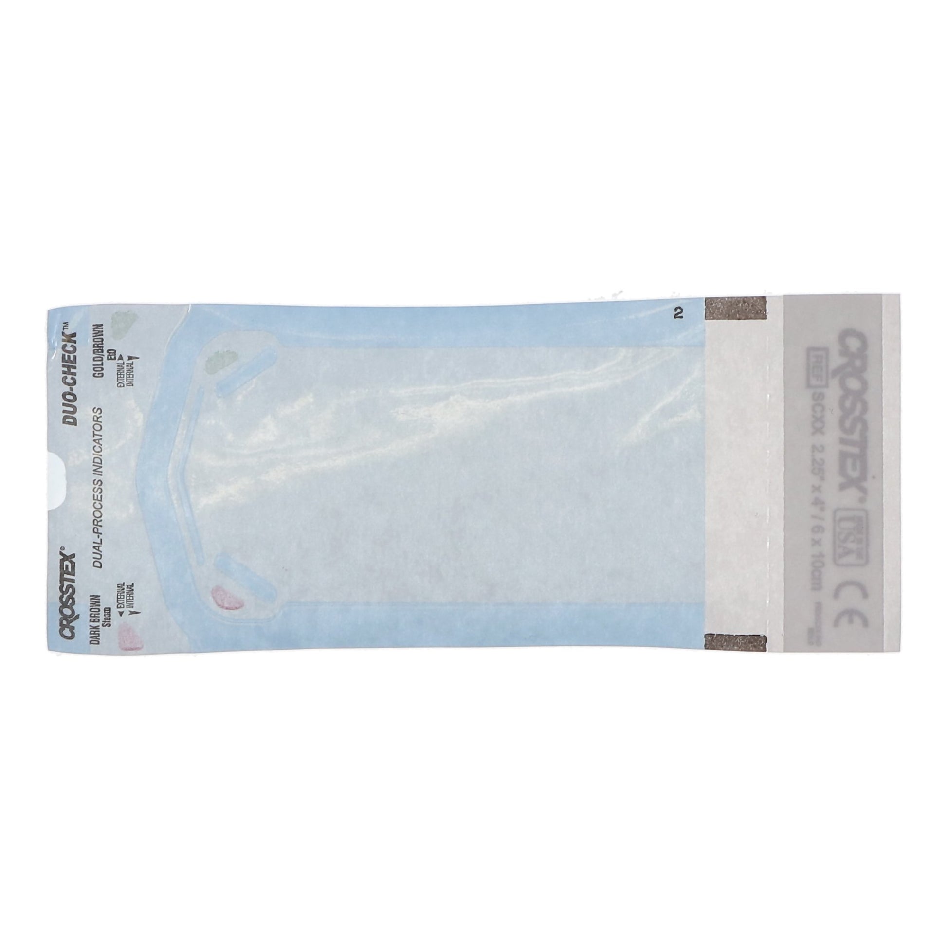 - Internal and external indicators change color with sterilization heat, are easily visible, and are compatible with steam (indicators turn light brown) and ethyl oxide (indicators turn dark brown) sterilization agents.