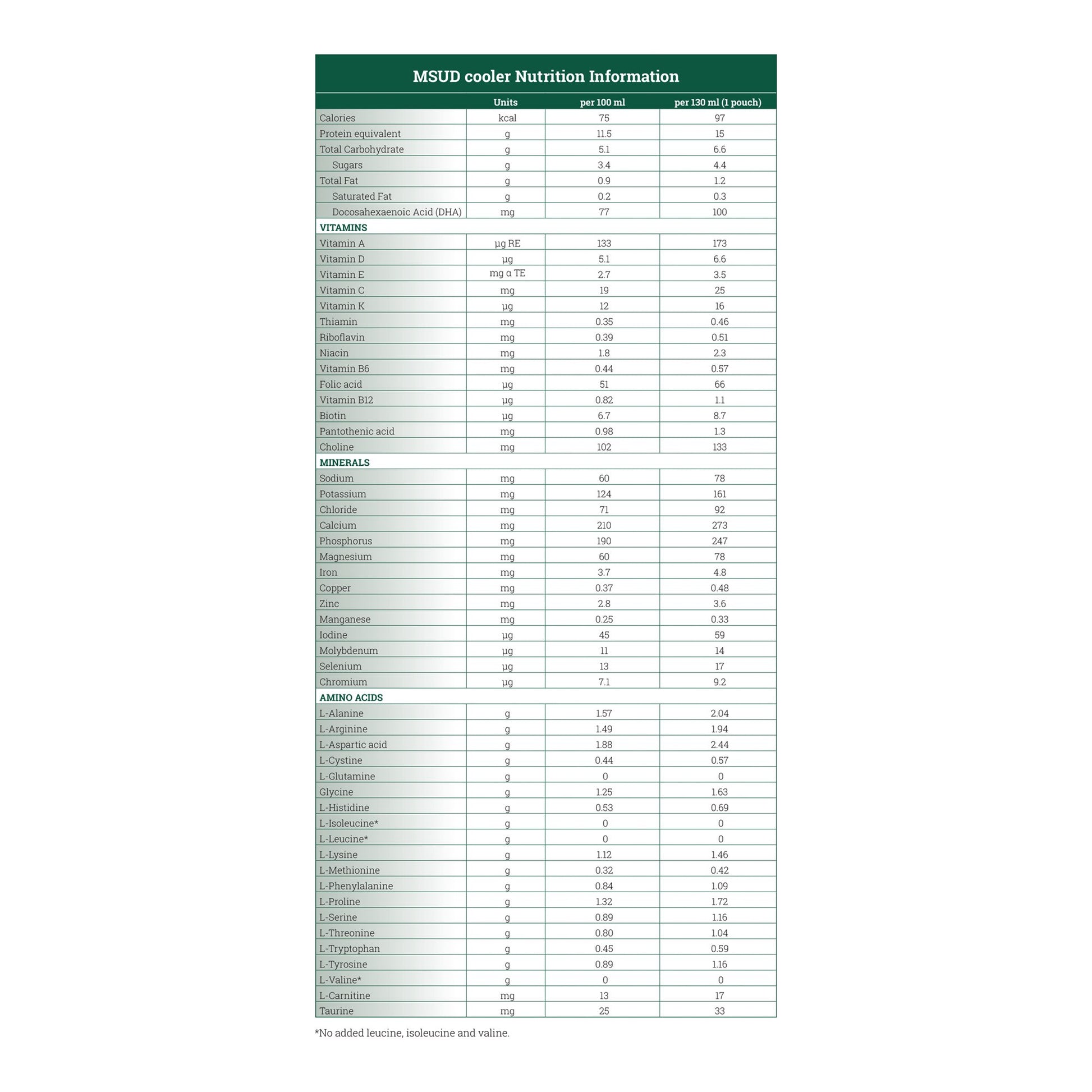 - MSUD cooler is a low volume, ready to drink leucine, isoleucine and valine free medical food for the dietary management of Maple Syrup Urine Disease.