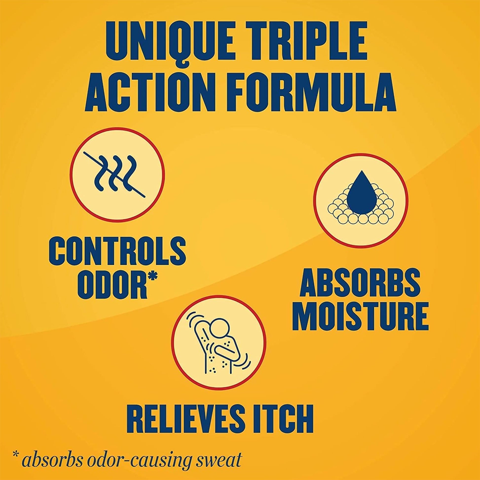 - Triple action formula absorbs odor causing sweat, controls odor and relieves itch