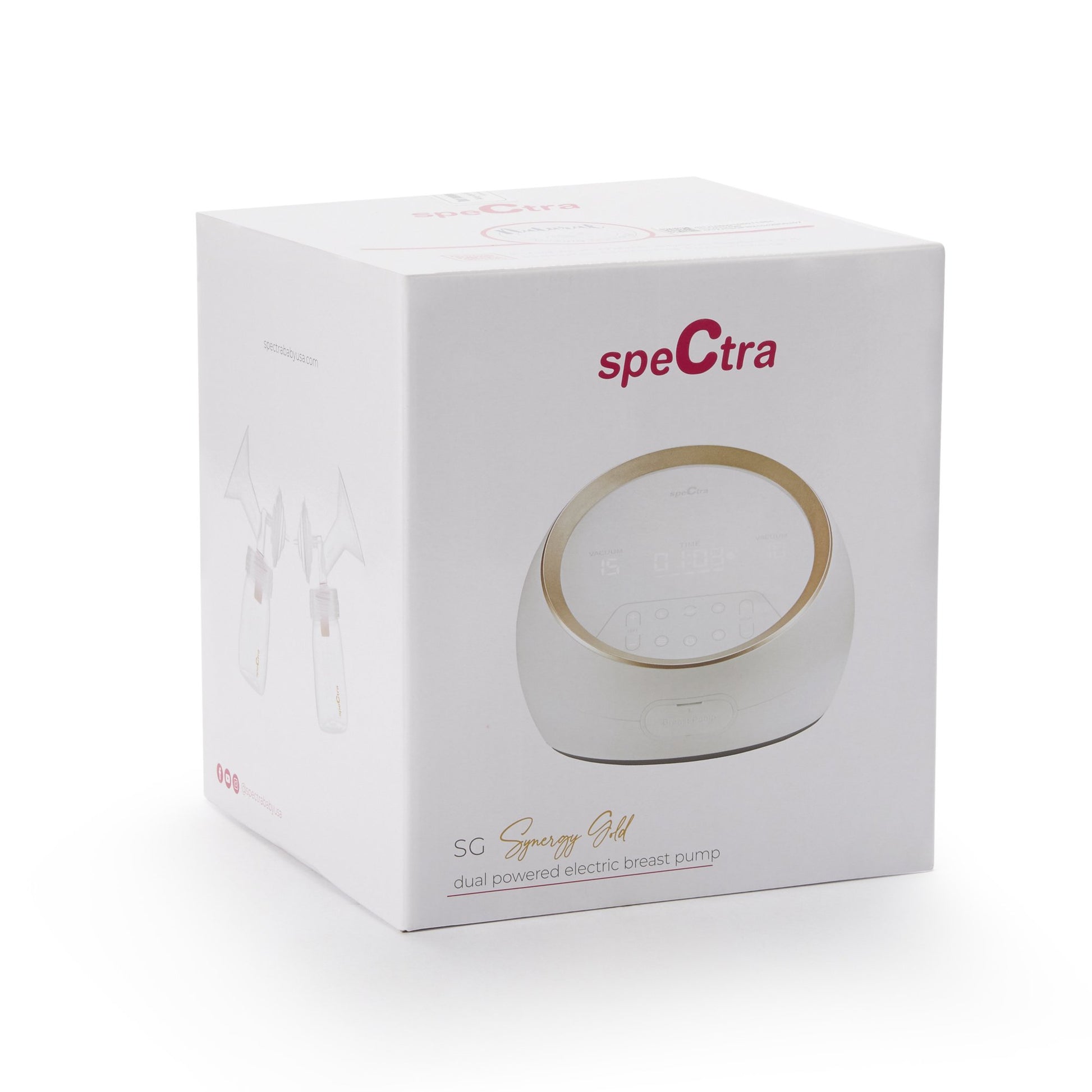 - Pump includes: Spectra Synergy gold breast pump with dual controls, two 24-millimeter Spectra breast flanges, two 28-millimeter Spectra breast flanges, two Spectra backflow protectors, two Spectra duckbill valves, two Spectra tubing with adapter ends for each tubing, two spectra wide neck storage bottles with pink logo, Spectra 12-volt ac power adapter.