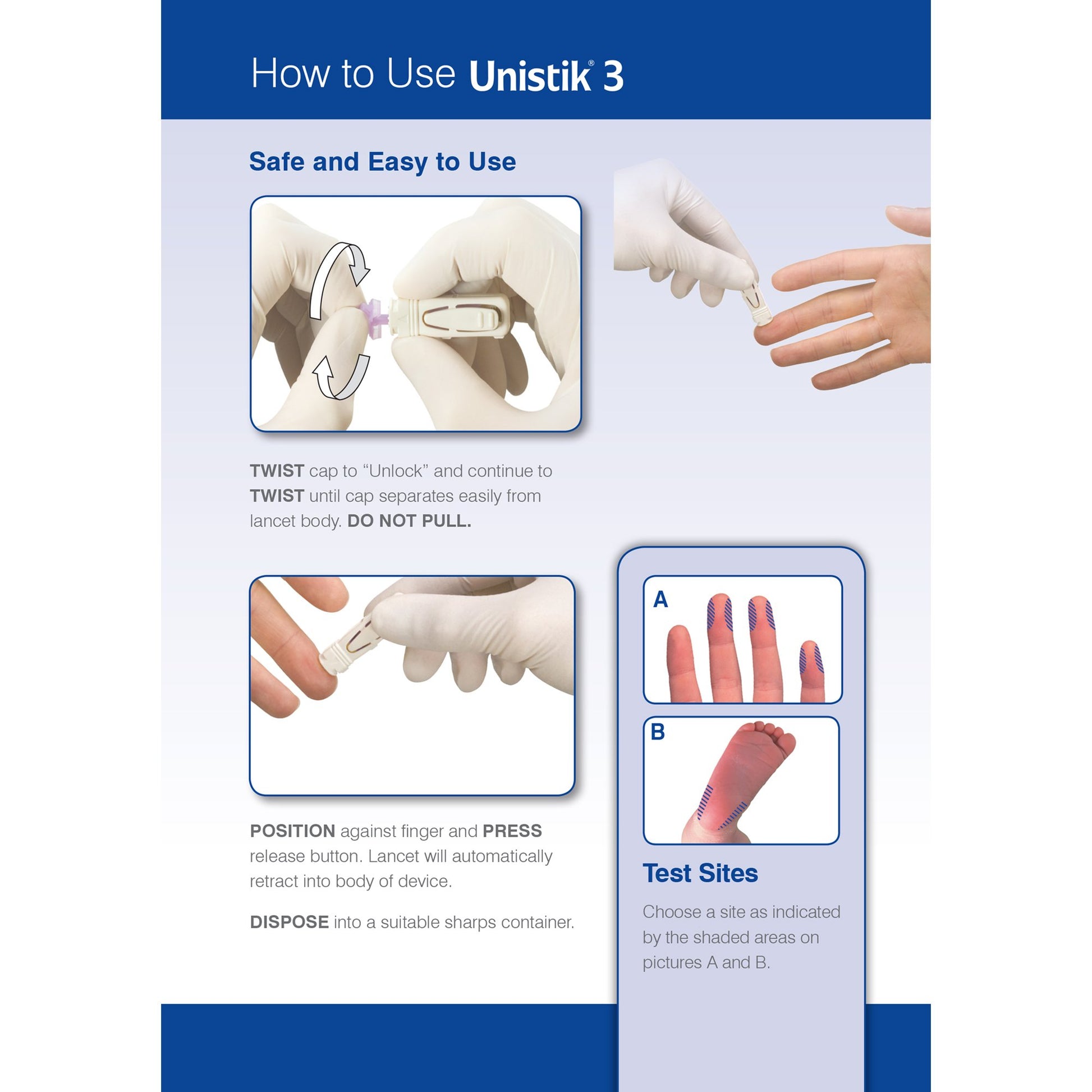 - Unistik 3 features a side release button which minimizes downward pressure against the sample site, which can cause unnecessary pain for the patient